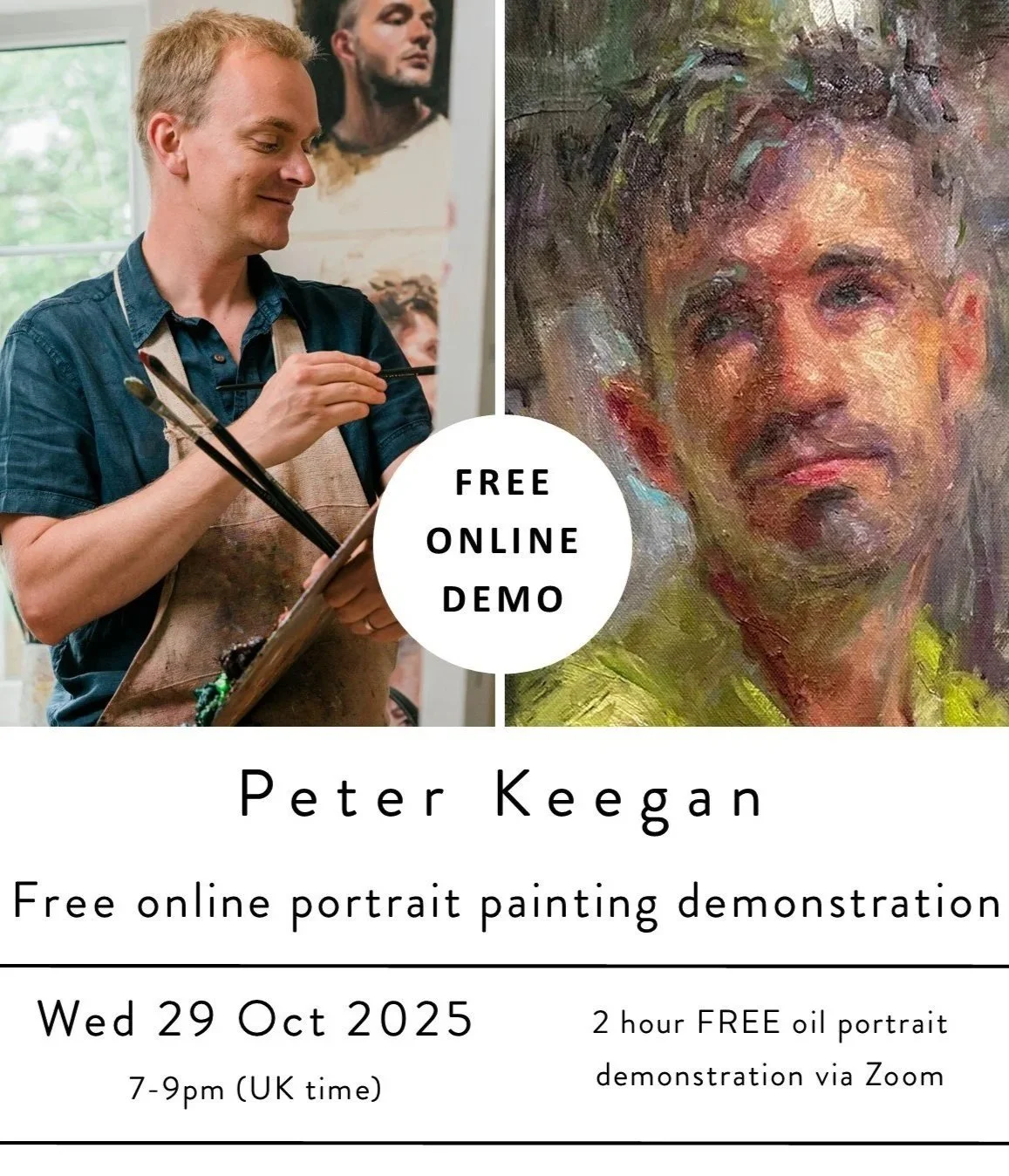 To celebrate the launch of Peter's new on-line winter classes this year, you are invited to watch a FREE two hour demonstration of Peter painting a head-and-shoulders portrait, live in his working studio.
